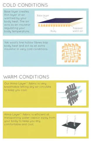In cold conditions, the thin layer of fabric next to your skin traps a layer of air between it and your body. Yak wool’s fine hollow fibres act as an extra insulator in very cold conditions. When you get too hot, your body sweats to release body salts and cool you down. The energy that’s exchanged when the sweat evaporates is what cools you.
